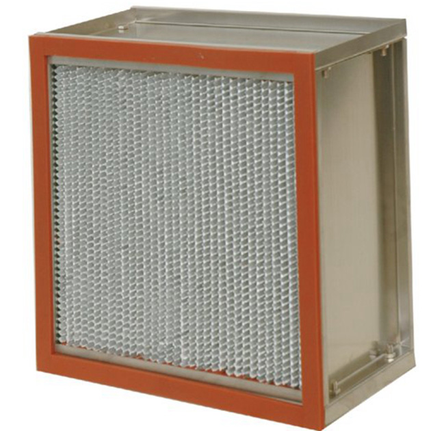 耐高温高效过滤器主要过滤0.3um~0.5um粒径微尘颗粒,具有效率高,耐温性好的特点,胶水采用进口耐温胶。耐温湿度150℃~350℃,采用铝隔分隔,整体美观,坚固耐用,耐高温高效过滤器使用有隔板设计,波纹形隔板可以精确地保持褶层间距,在***小阻力下,限度地利用滤料,过滤器滤材两面180褶翻褶形褶层,滤料折弯时有两道压痕,使其在隔板的尾端开成锲形盒式褶层,锲形盒式褶层可以防止滤料破损。